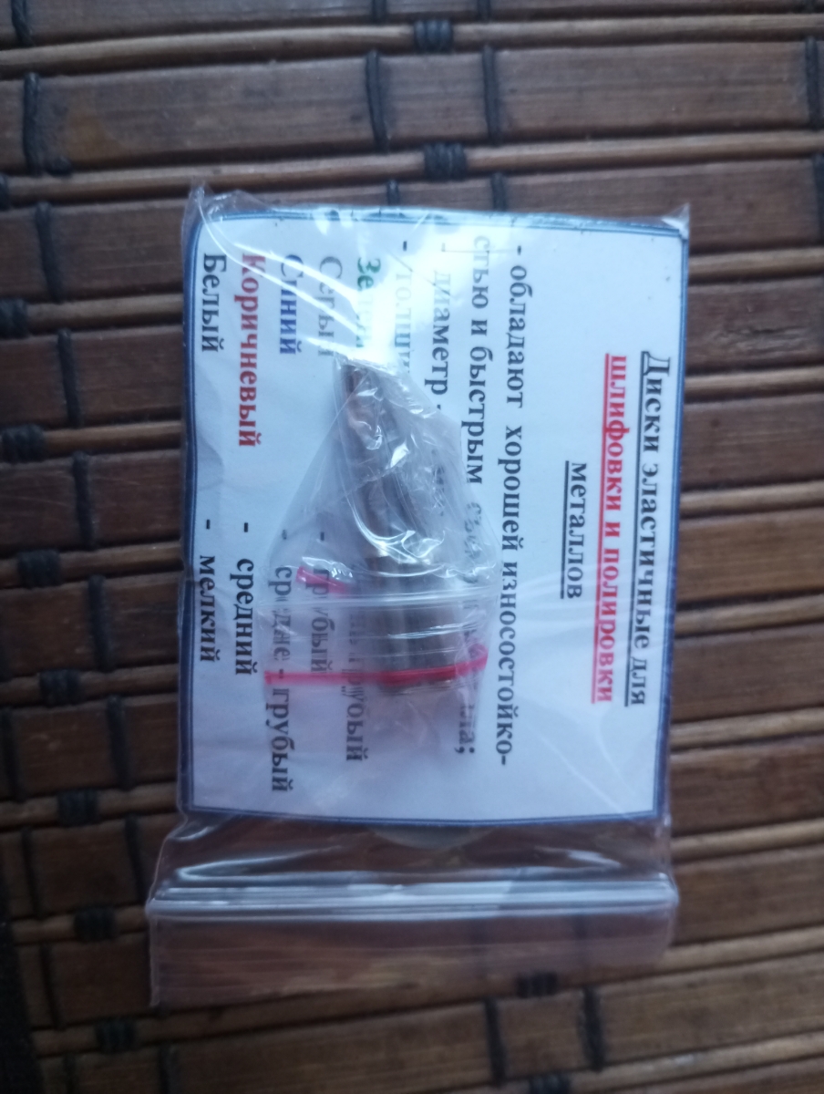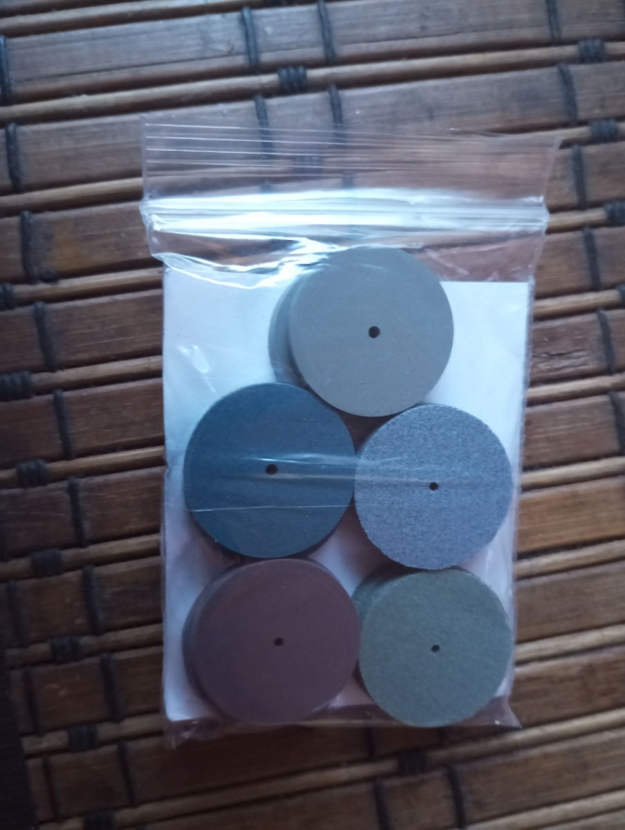 Набор шлифовальных кругов включает в себя 10 дисков разного цвета: белый, коричневый, синий, серый и зеленый. Различные цвета дисков соответствуют разной зернистости абразивного слоя: зеленые для шлифовки твердых сплавов; серые для грубой шлифовки; синие для общей шлифовки; коричневые для тонкой шлифовке; белые - полировка.
