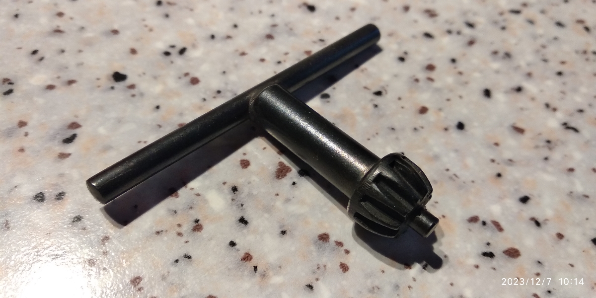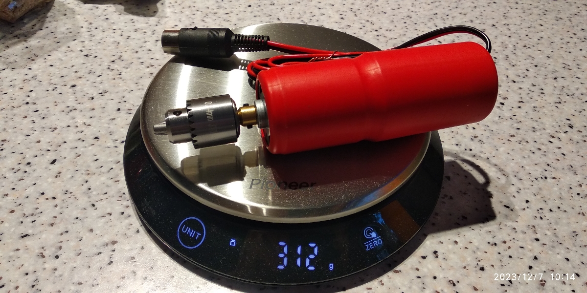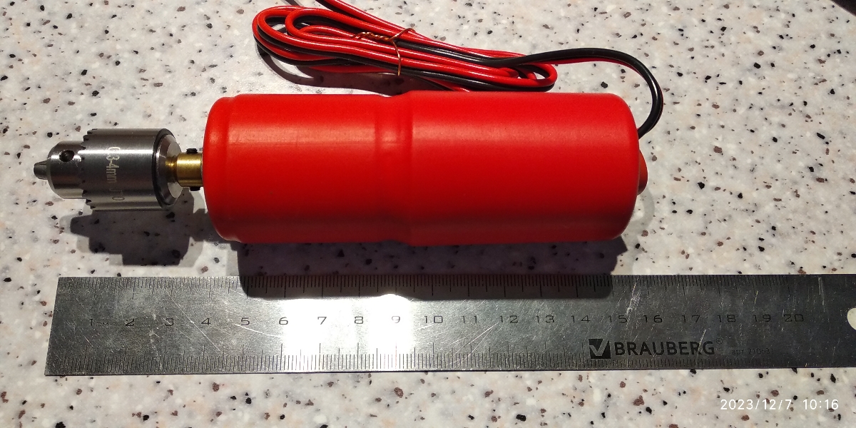 Длина с патроном 15 см, диаметр 4 см. Вес дрели с патроном 300г.