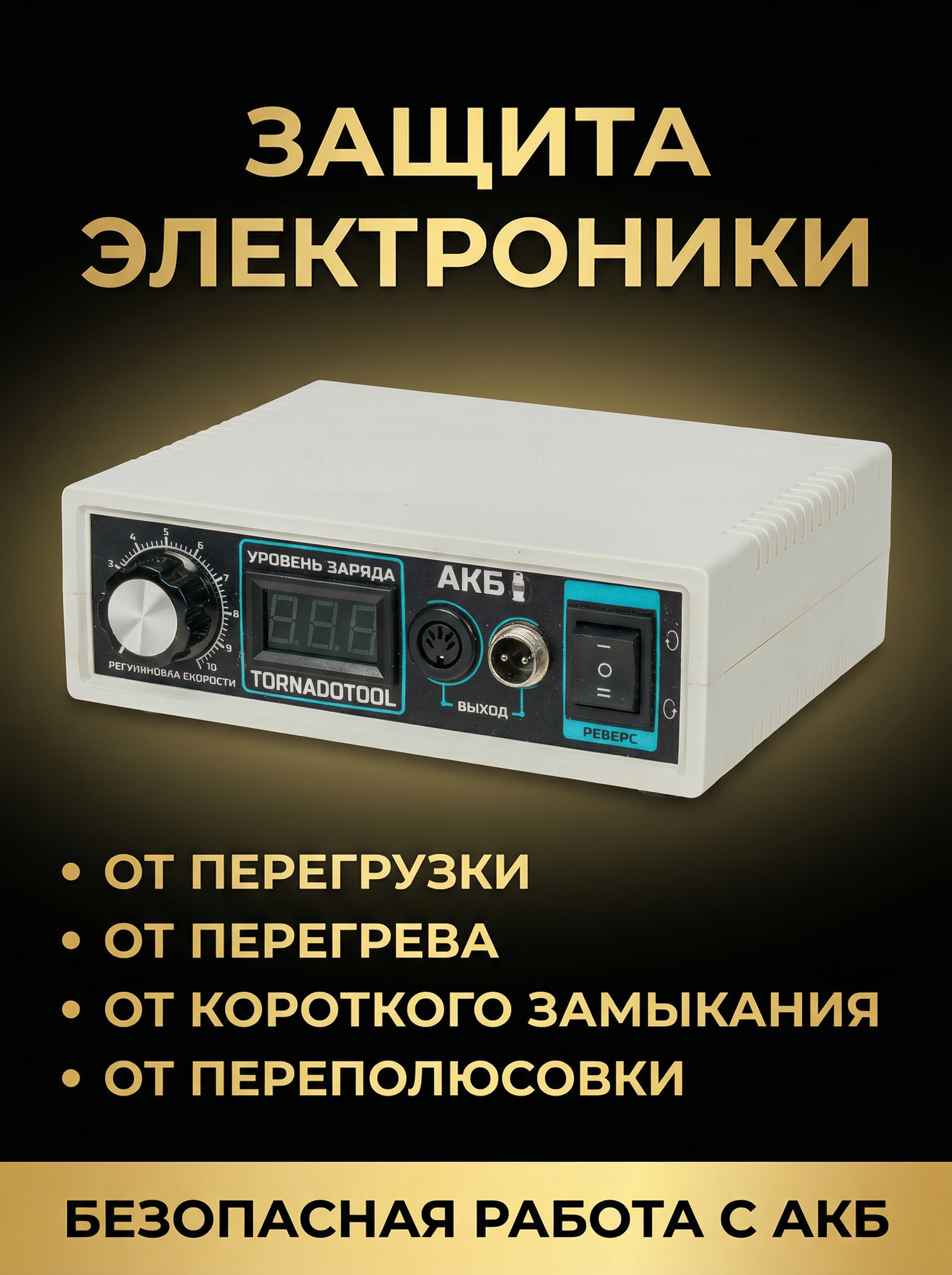 Блок поддерживает плавную регулировку оборотов, имеет реверс, отдельный вход для педали и электронную защиту от перегрузки, перегрева, короткого замыкания и переполюсовки. Индикатор на панели показывает уровень заряда АКБ.