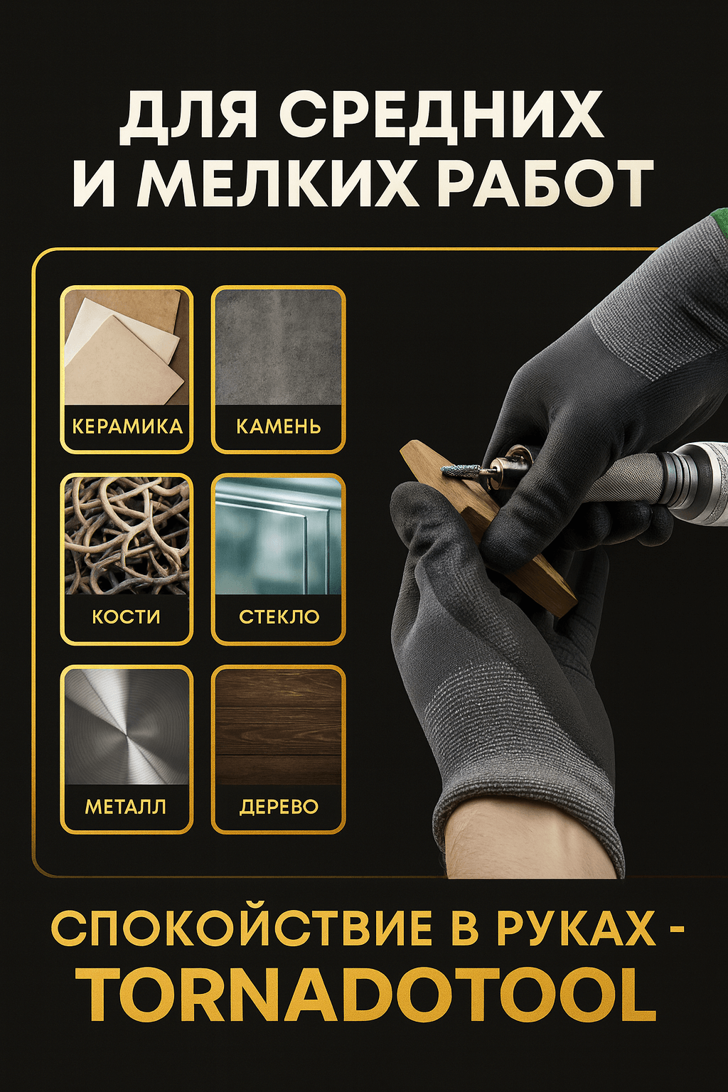 Применяется для абсолютно любых средних и мелких работ - отрезание, гравировка, фрезеровка, шлифовка, очистка, полировка и др. по камню, пластику, кости, стеклу, керамике, дереву, цветным и черным металлам.