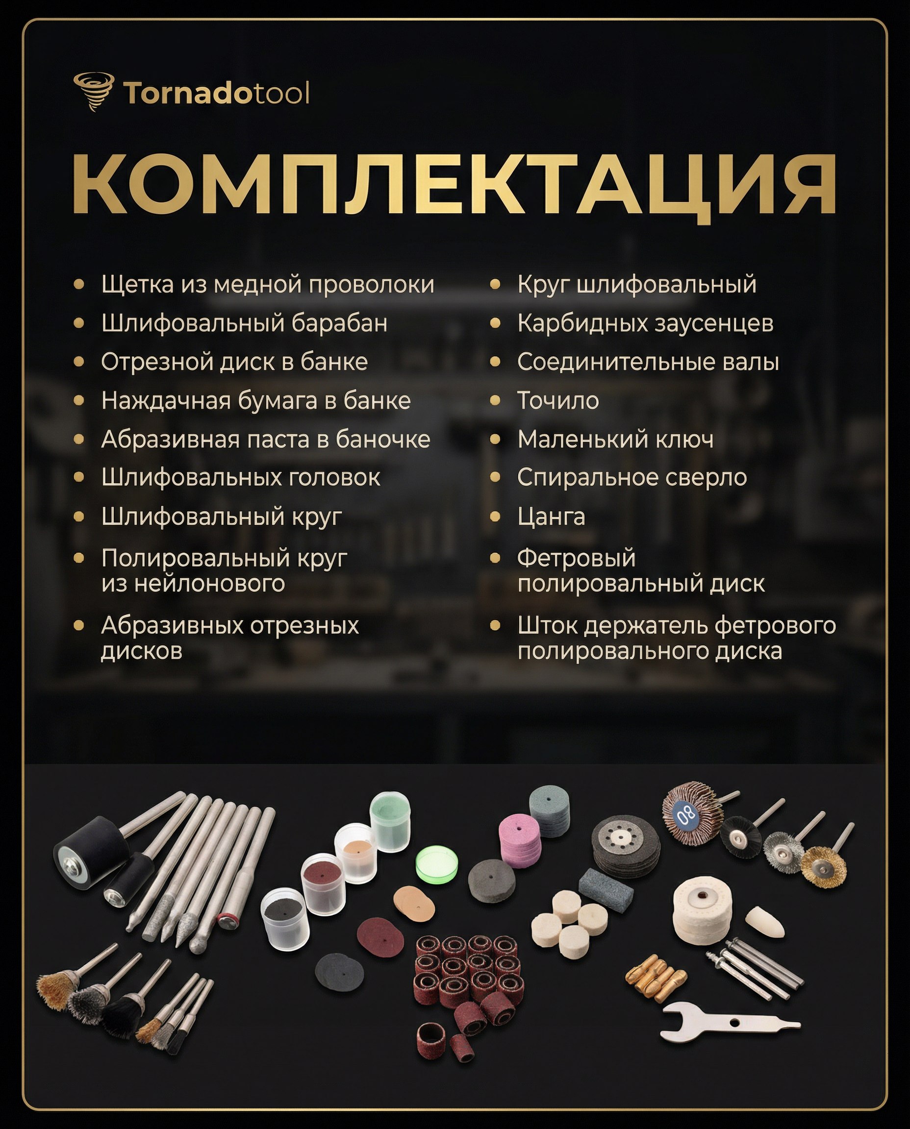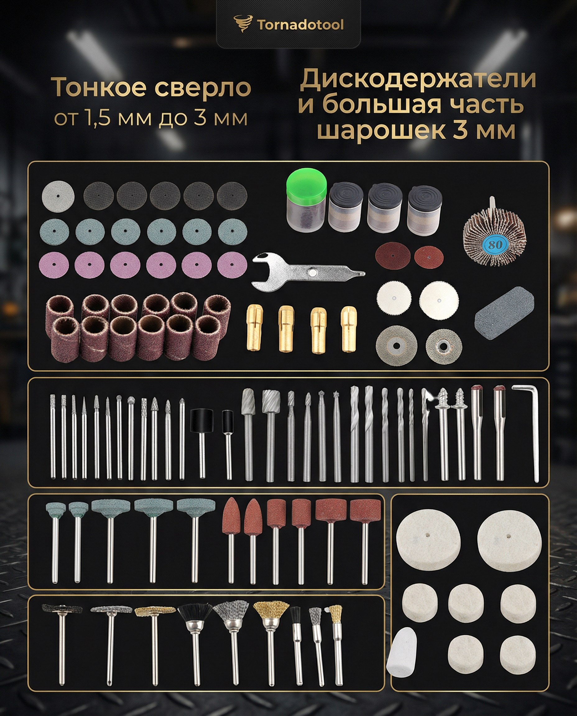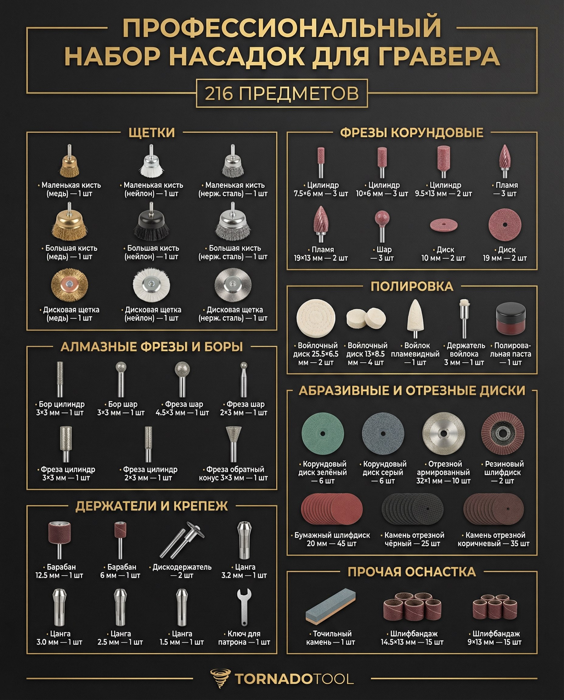 Содержит большой выбор насадок разной зернистости и формы для высокоточных работ по резке, шлифовке, полировке металла, пластика, древесины и других материалов. Благодаря этому можно выполнять работы любой сложности и даже в труднодоступных местах Он используются при проведении плотницких, слесарных и столярных работ, является незаменимым помощником при строительстве или ремонте. Также насадки применяются при обработке драгоценных камней, металлов, и в других областях, требующих качественной и высокоточной гравировки.