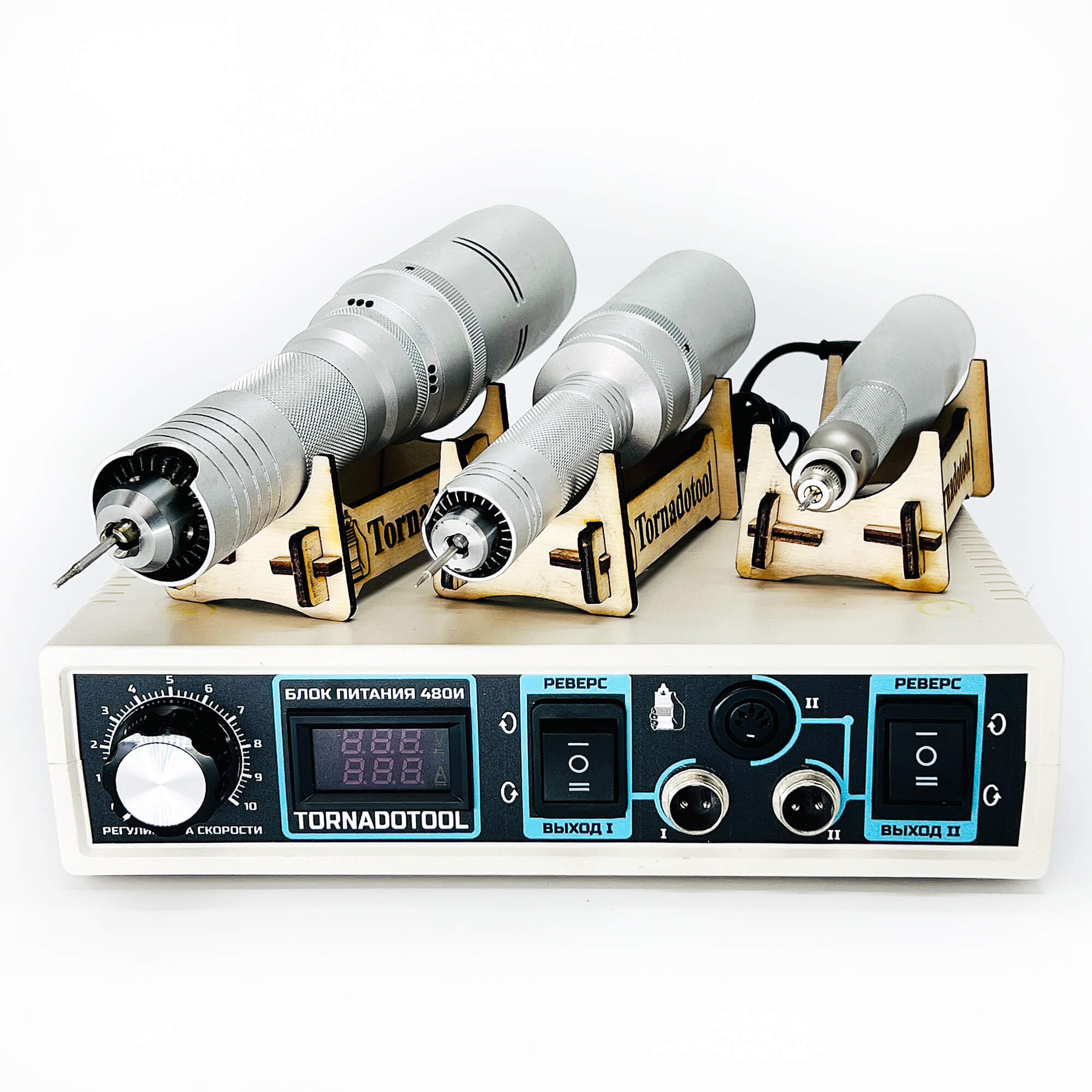 - импульсный блок питания "Tornadotool 480И" с плавной регулировкой оборотов, индикатором напряжения, двумя входами и отдельным разъемом для педали;