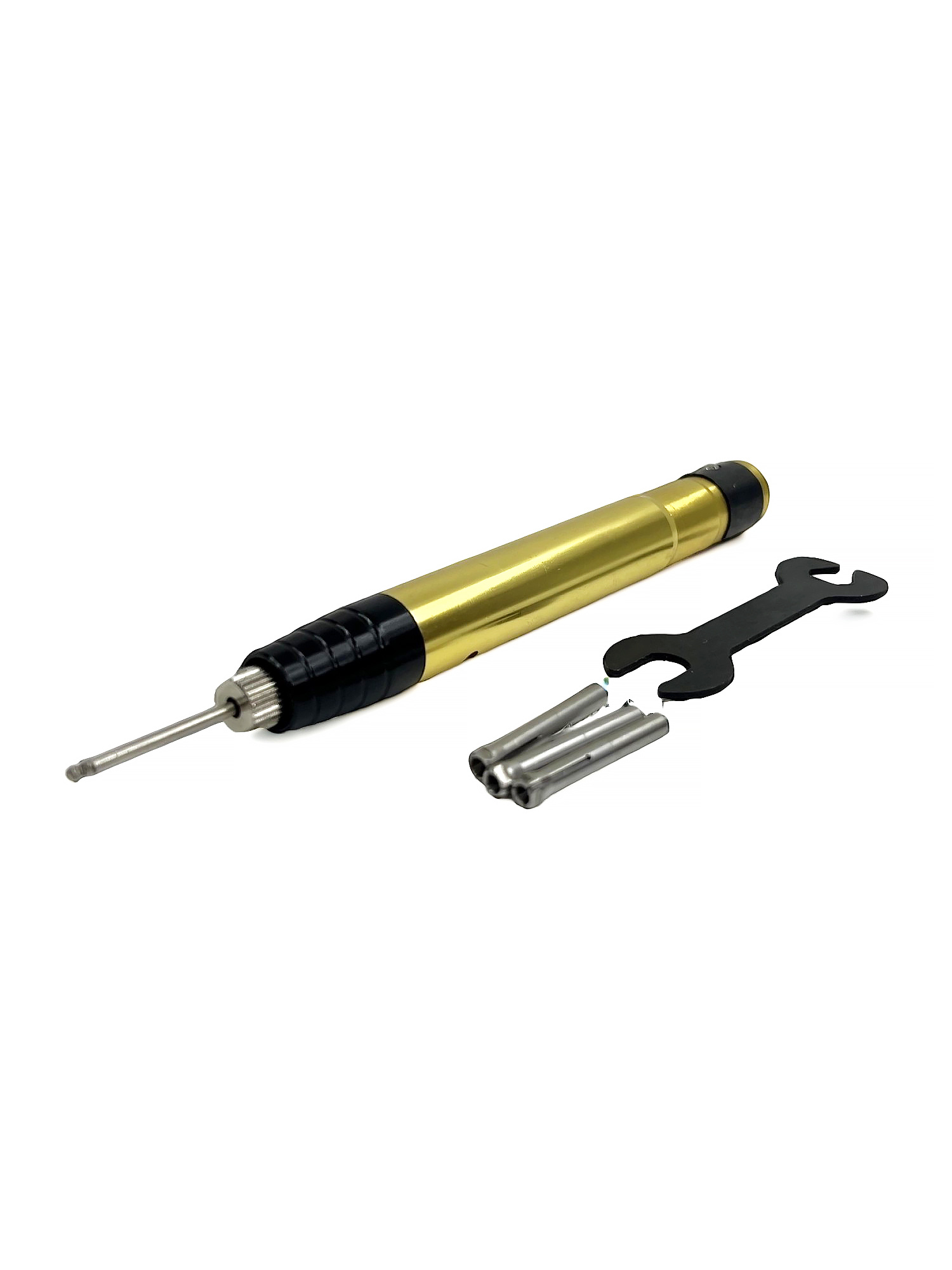 Комплектация: Наконечник, 3 сменных цанги, ключ для зажима цанг.